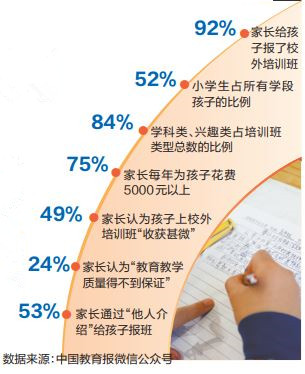 近日,中国教育报微信公众号就“校外培训机构”话题开展了专项调查,结果显示,近4000名参与调查的家长中,有92%给孩子报了校外培训班,其中,超半数孩子就读小学阶段,半数家庭每年为孩子校外培训班花费超过1万元,25%的家长选择校外培训班的渠道是广告宣传。