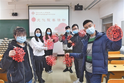 2月4日,北方“小年”,河北大学留校学生与老师一起剪窗花。 郭占欣 摄